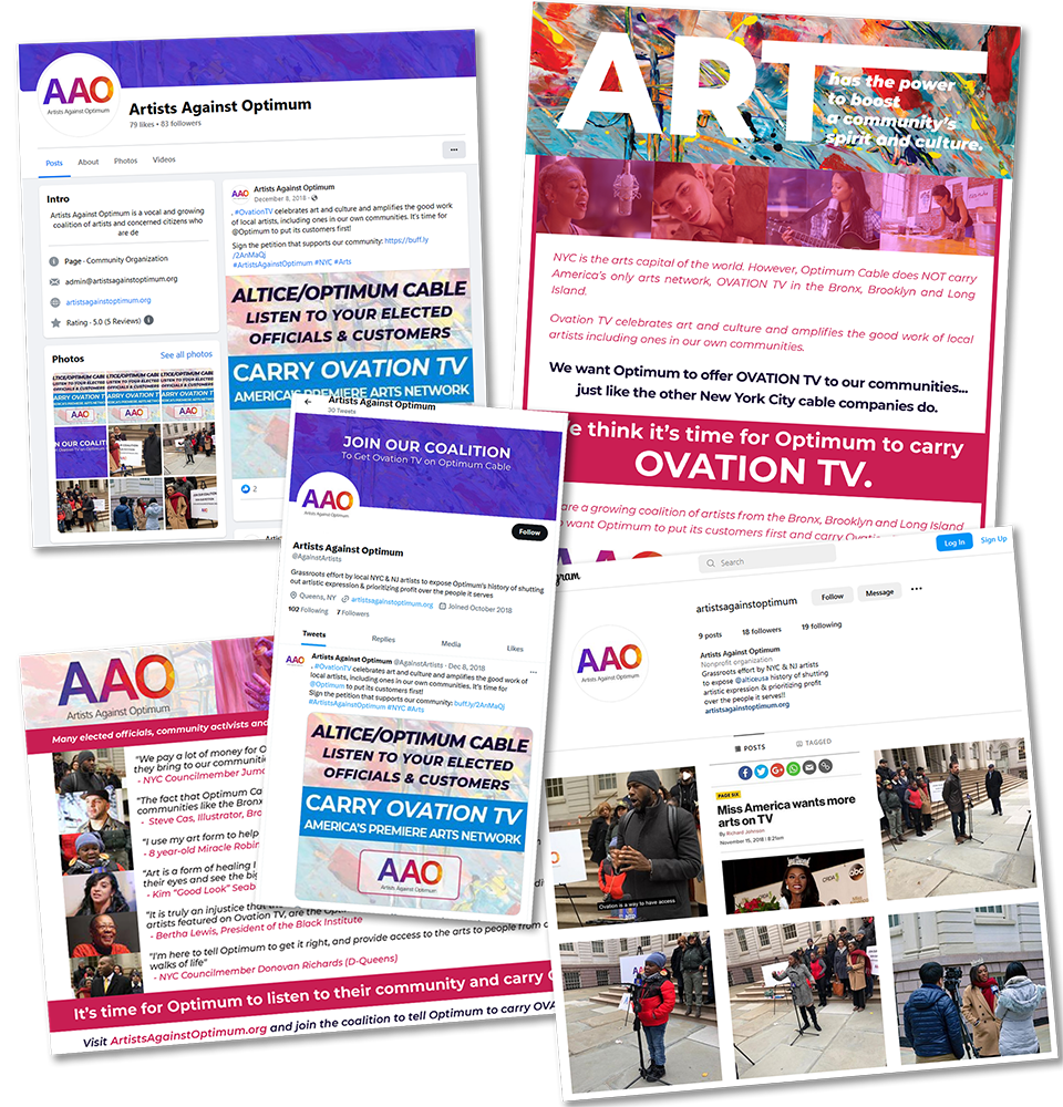 The visual package for Artists Against Optimum was created with the intention of raising awareness about the negative impact of Optimum’s business practices on artists and their livelihoods. The videos produced for social media and broadcast were designed to be attention-grabbing and emotionally impactful, featuring interviews with affected artists and footage of their work. The print ads were strategically placed in newspapers throughout New York City to reach a wide audience.
